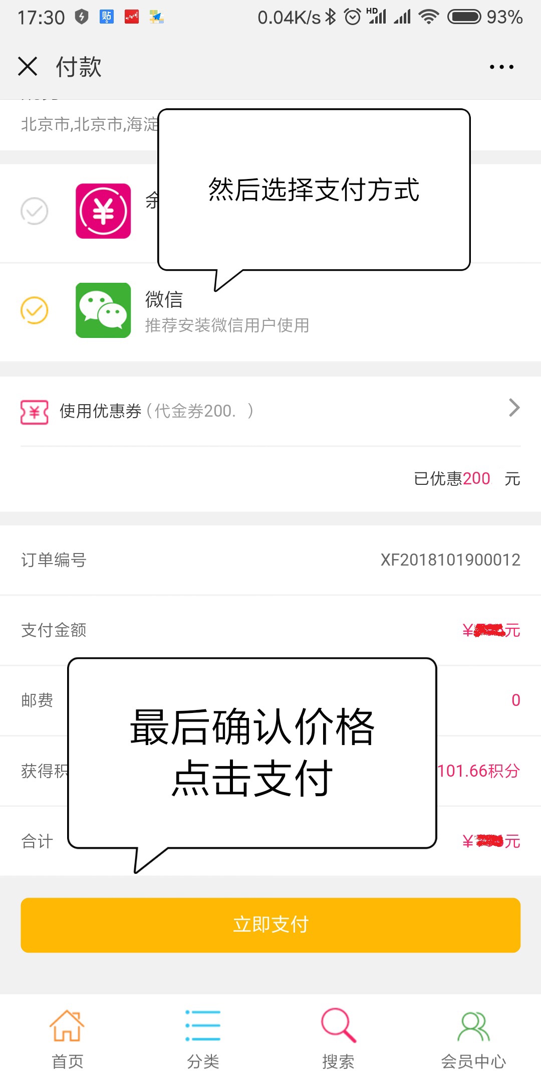 第五步:選擇支付方式(使微信前的√對勾符號為黃色)